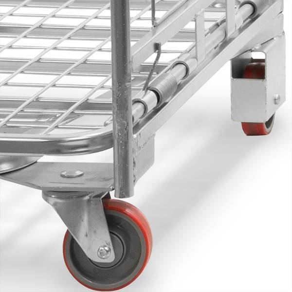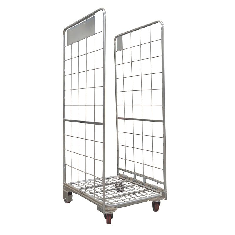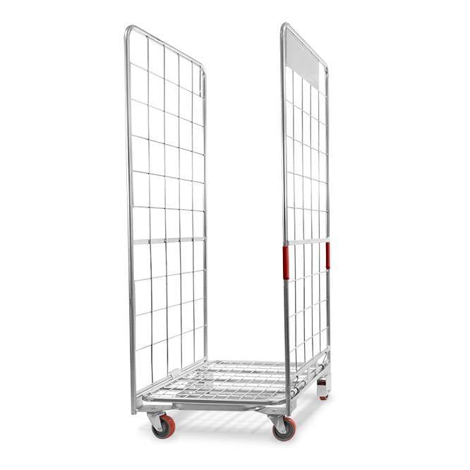 Roll container apilable para venta minorista de 2 laterales de con una estructura en forma de A. El diseño ergonómico y el exclusivo sistema de resortes del fondo plegable aseguran que pueda usar el roll container cómodamente