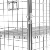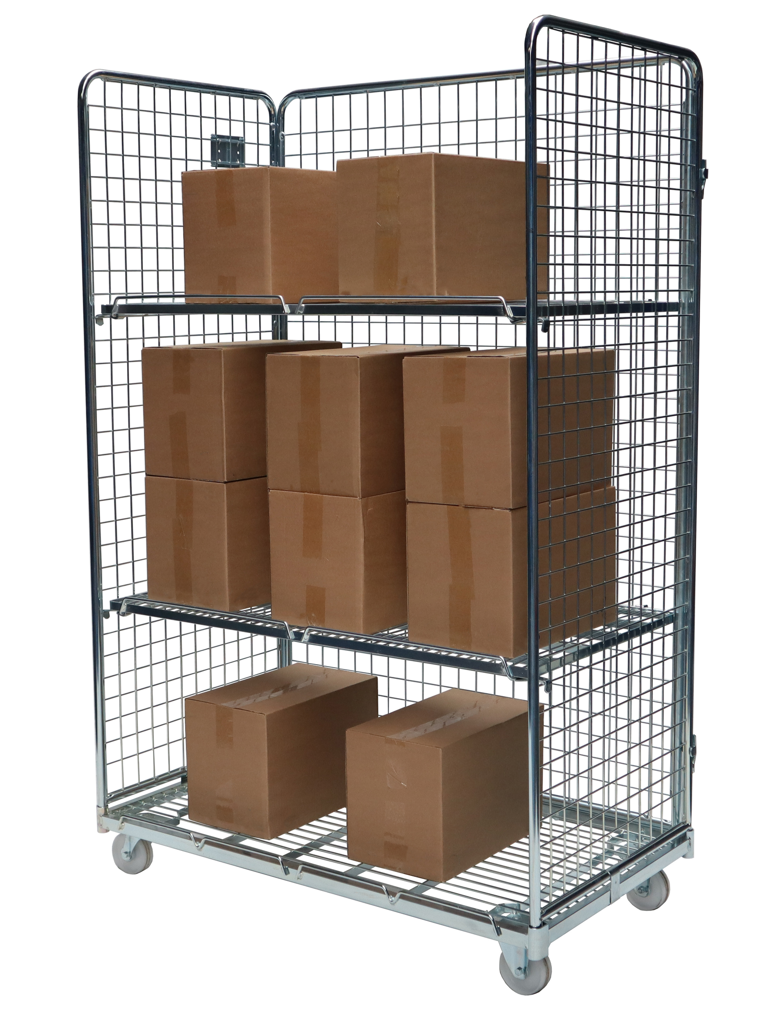 Roll container de 3 laterales con una capacidad de carga máxima de 500 kilogramos. El roll container tiene un fondo de gitter de malla. Estándar equipado con 2 estantes con borde elevado para garantizar que no se caigan las cajas
