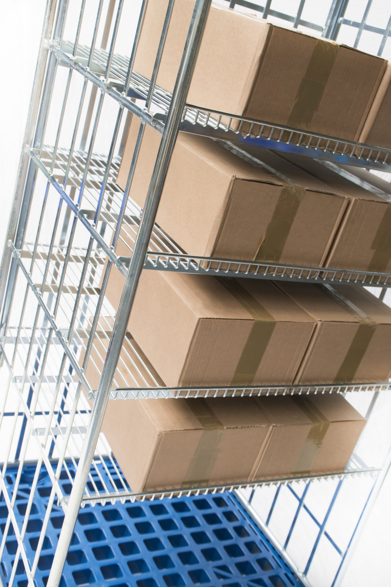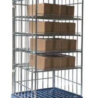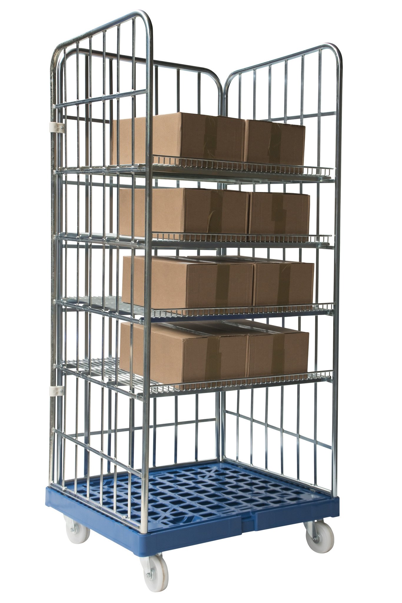 Roll container de 3 laterales con una capacidad de carga máxima de 500 kilogramos. El roll container tiene un fondo de plástico reforzado y 3 laterales. Estándar equipado con 4 estantes con borde elevado para garantizar que no se caigan las cajas