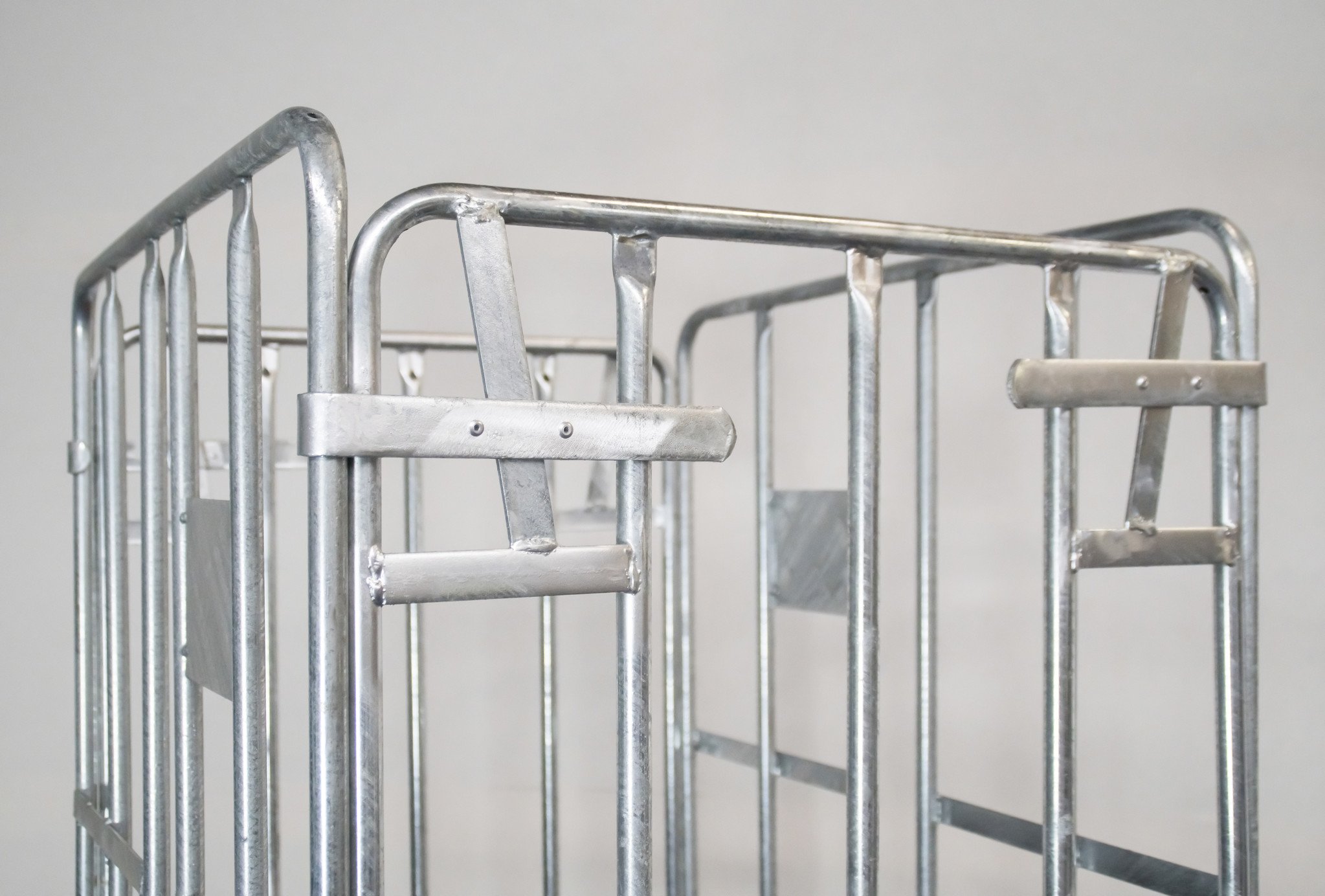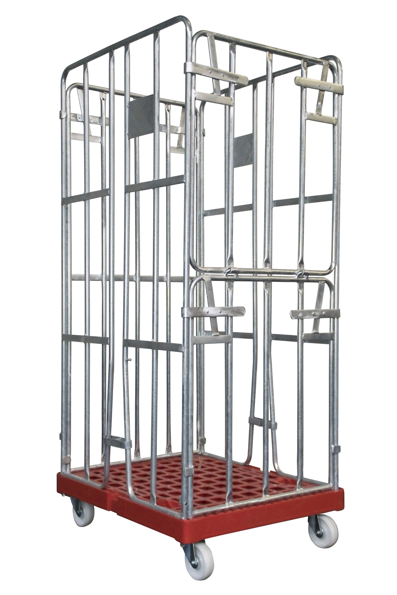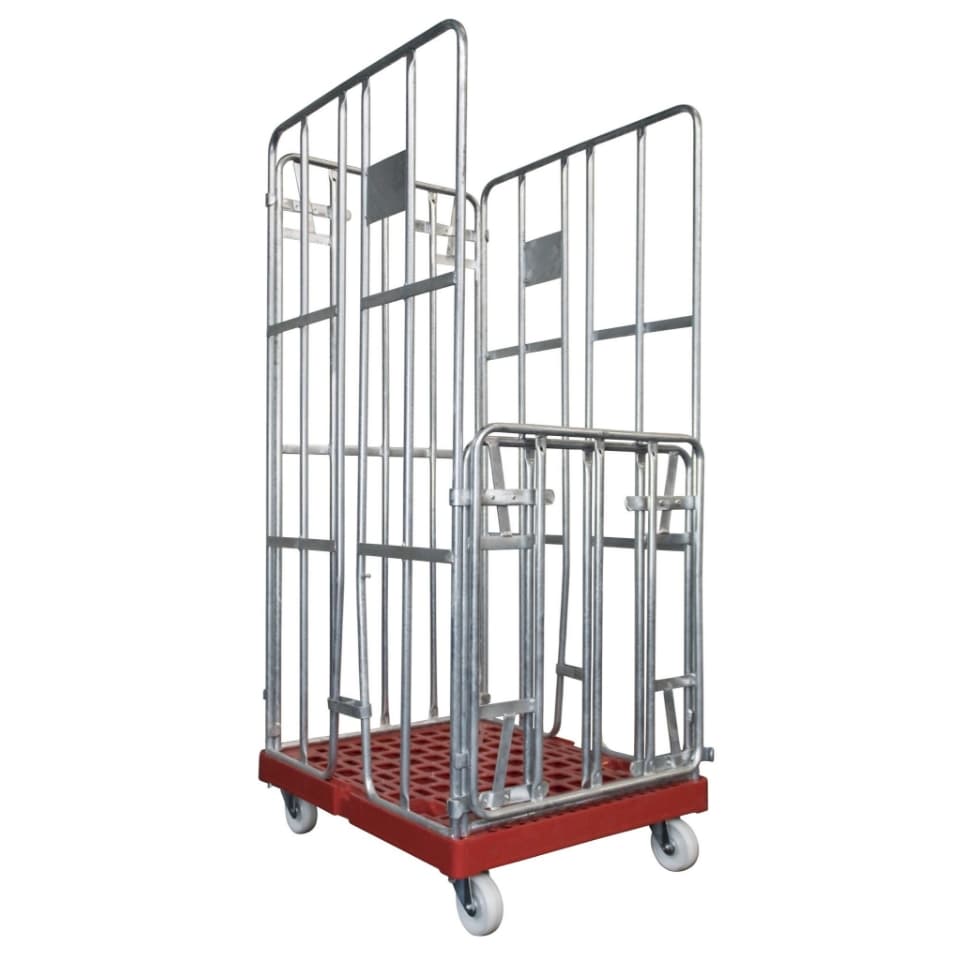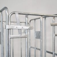 Roll container con 4 laterales y dimensiones de. Equipado con fondo de plástico con ruedas PP de 108 mm. Los laterales están galvanizados por inmersión en caliente, lo que lo hace más duradero. Ideal para almacenamiento y transporte