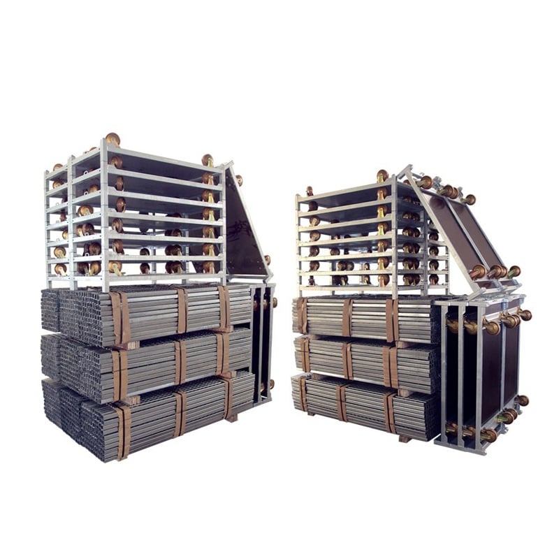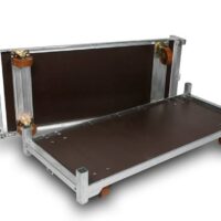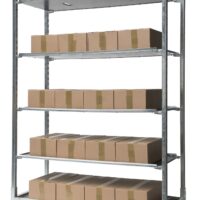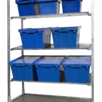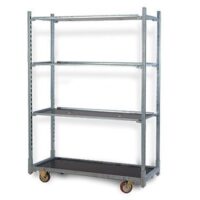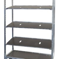 Los estantes y los marcos frontales están fabricados con madera contrachapada impermeable de 5 capas, las partes metálicas están galvanizadas. El peso neto de esta estantería es de 4 kg. Dada la similitud entre el carro danés y el contenedor CC, estas estanterías, incluidas las bandejas recogegotas, también encajan en los contenedores CC. La estantería permite varios pisos y, por tanto, un mejor aprovechamiento del espacio del contenedor de bobinas. Esta estantería puede cargarse con hasta 50 kg. Las dimensiones de la estantería son 1275×555 mm.