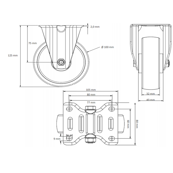 Rueda fija D-100 mm con distintas configuraciones de medida. Revisa las variaciones para ver pesos y dimensiones.